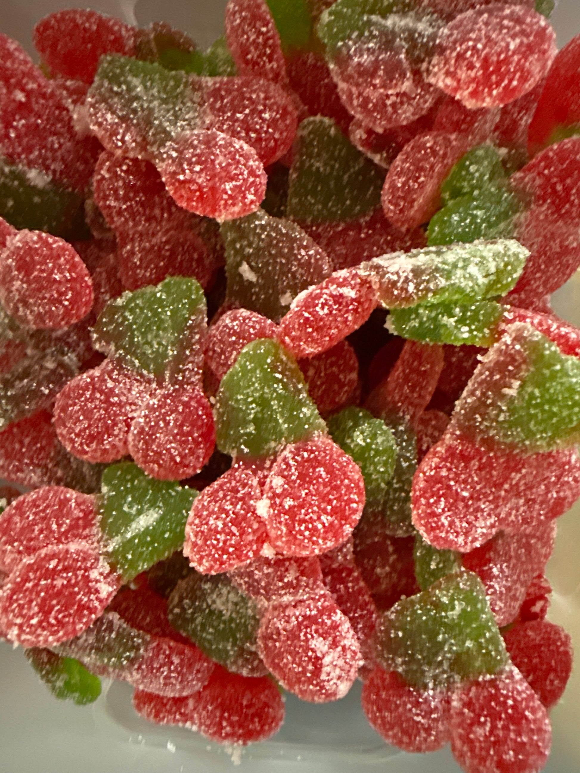Bonbon acide en forme de cerise, rouge et vert, avec une saveur de cerise.