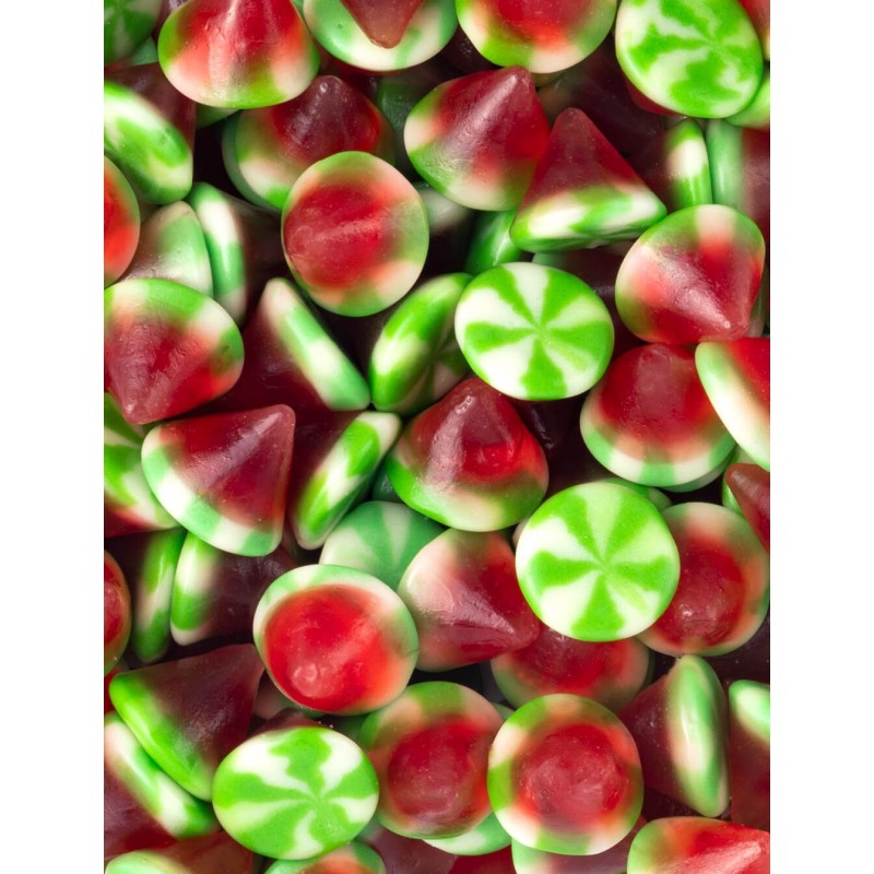 Bonbon lisse en forme de cône, rouge, blanc et vert, avec une saveur de fraise.