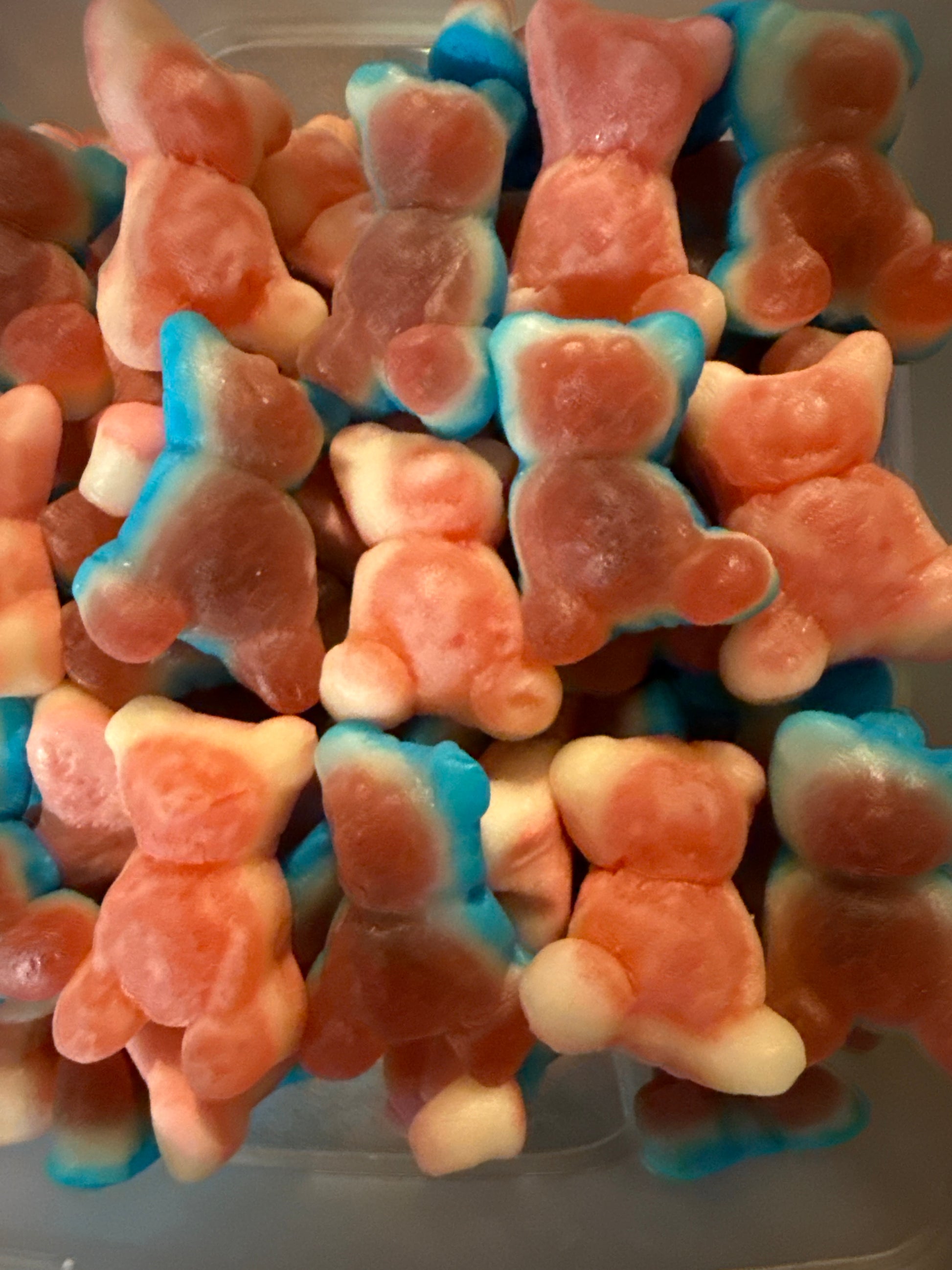 Bonbon lisse en forme d’ourson wk, bleu et rose avec une saveur de fruit fourrée.