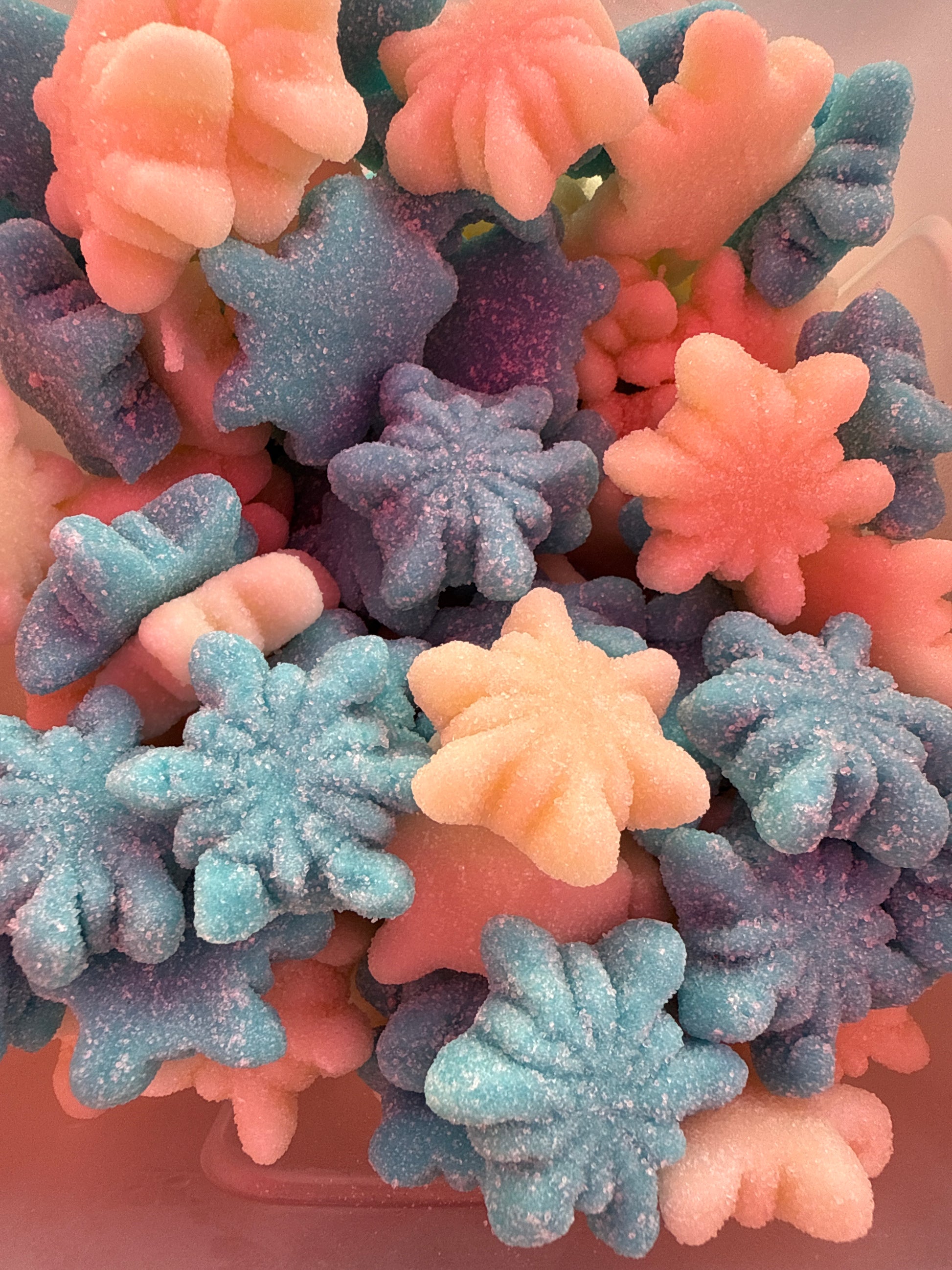 Bonbon sucré en forme de flocon de neige, bleu et blanc, avec une saveur de fruit