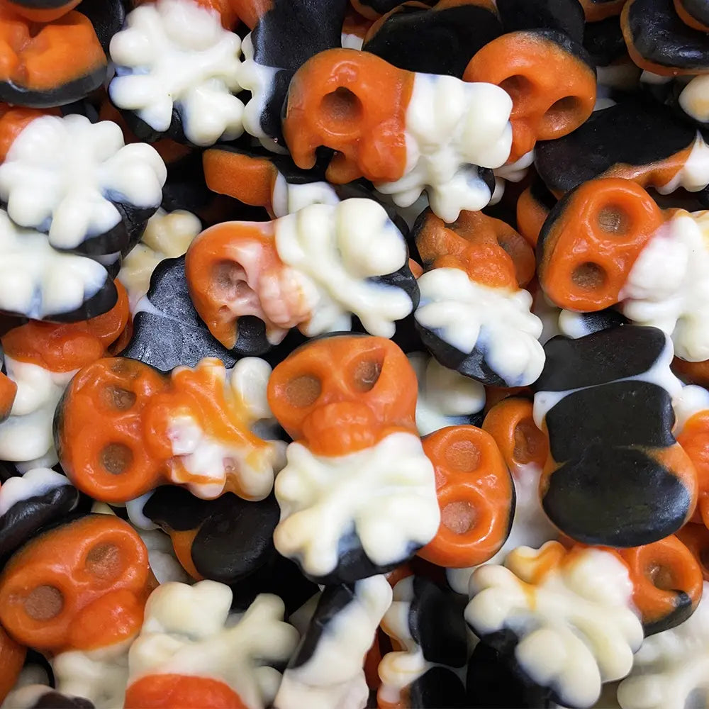 Bonbon lisse en forme de pirate, orange, blanc et noir avec une saveur de fruit.