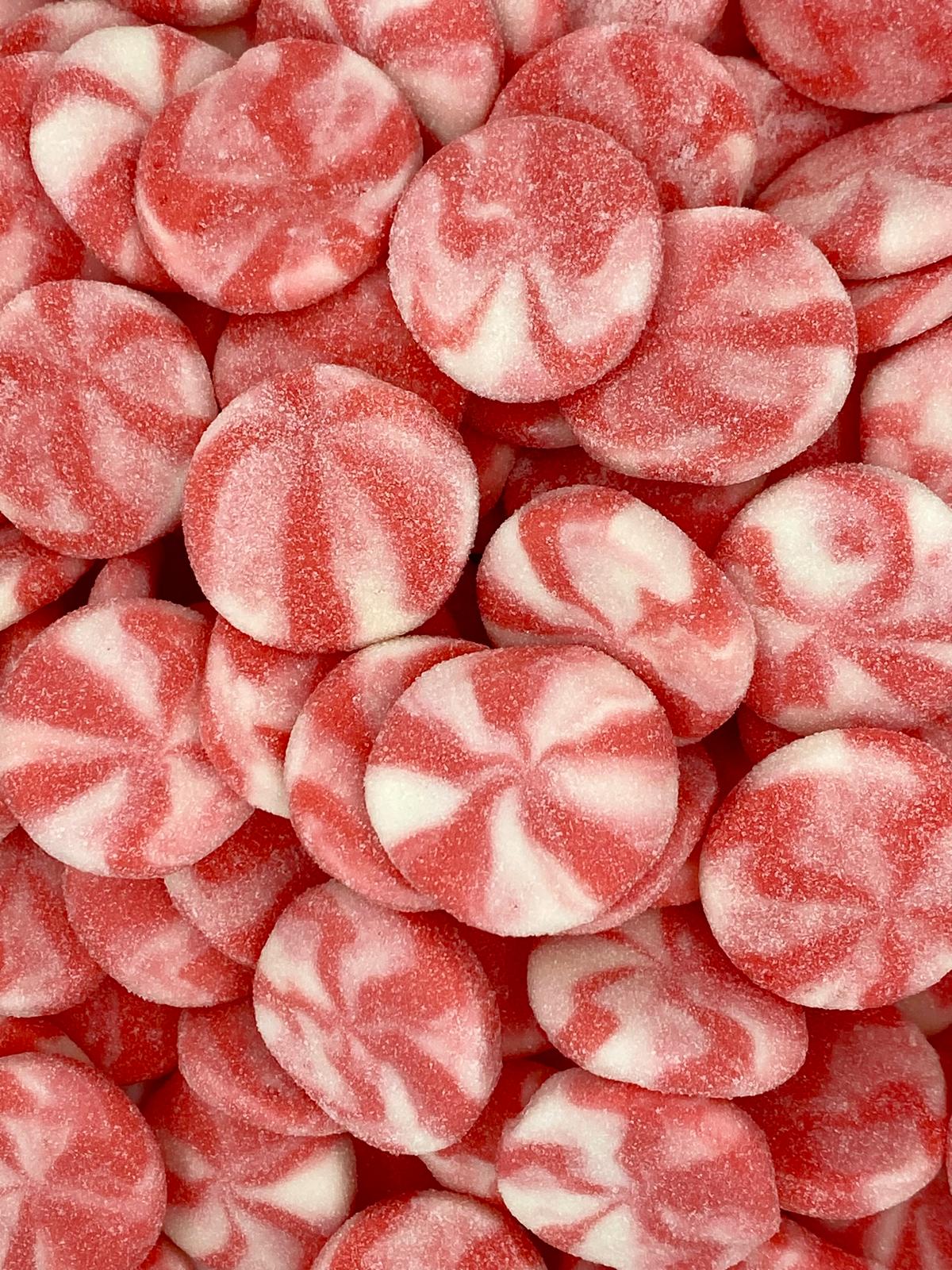 Bonbon sucré en forme de spirale, blanc et rouge, avec une saveur de fraise.