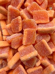 Bonbon acide en forme de tranche, orange, avec une saveur de pêche.