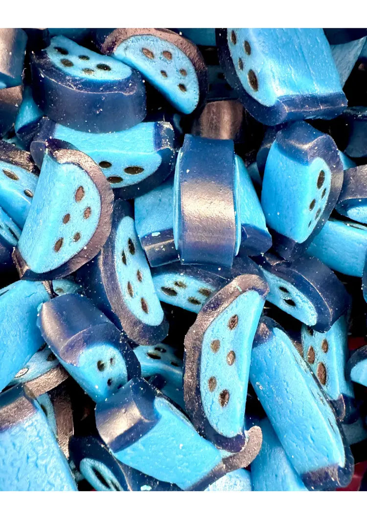 Bonbon lisse en forme de tranche de framboise, bleu avec une saveur de framboise